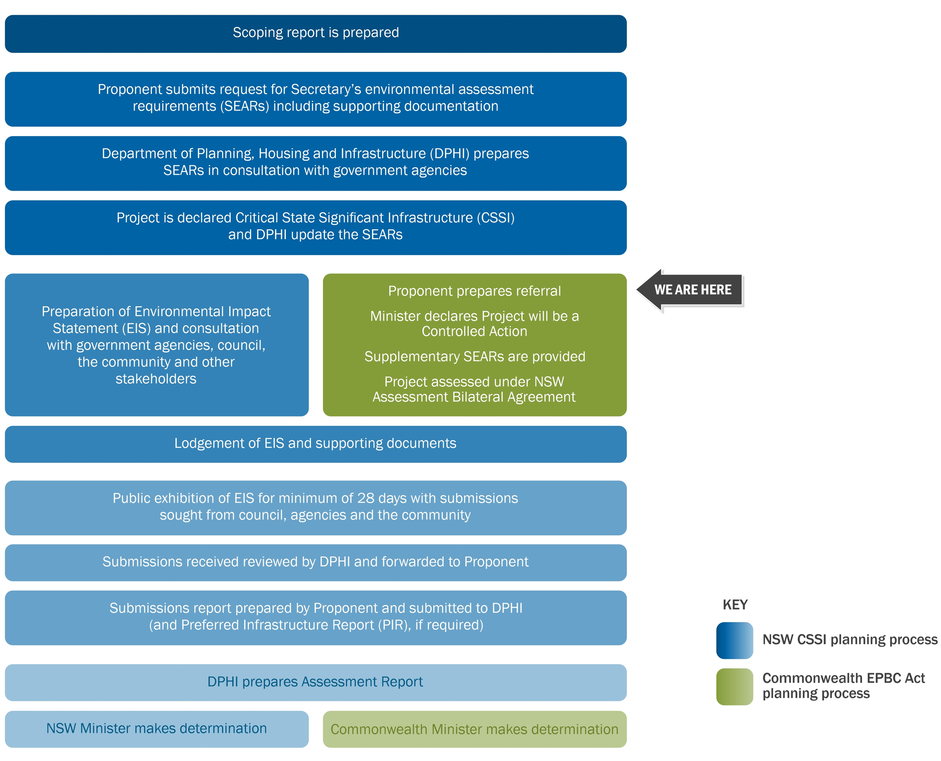 A project scoping report was submitted to the Department of Planning, Housing and Infrastructure in December 2023. The scoping report provided an overview of the project and proposed environmental, social and cultural assessments to inform an environmental impact statement (EIS).